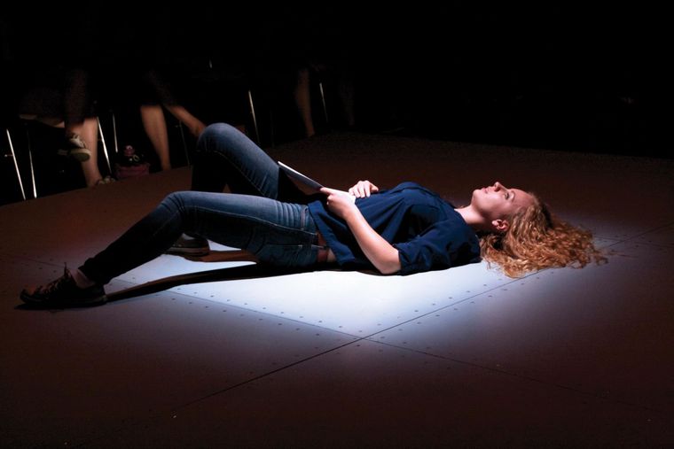 I also just added a new play, RIGHT HAND, RED, to my plays page. We did our first Madness on the set of Brick Monkey Theater Ensemble’s production of George Brant’s GROUNDED. The set was designed by the head of Ohio’s Theater Division, Michael Lincoln. Michael does light design for Broadway and regional theaters. He had an amazing light design which lit up 9 different cubes from above. We never have such cool lighting so I wrote a piece that could utilize it for the week we had access to it. The two pictures in the post are from rehearsal for that piece that were taken by the Athens Post photographer. My actors were Connor Baker and Constance Sabo.